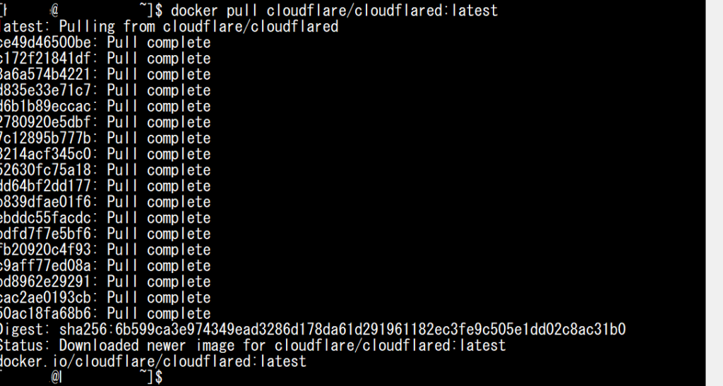docker pull cloudflare/cloudflared:latest の実行結果。「Status: Downloaded newer image」が表示されたSSH画面