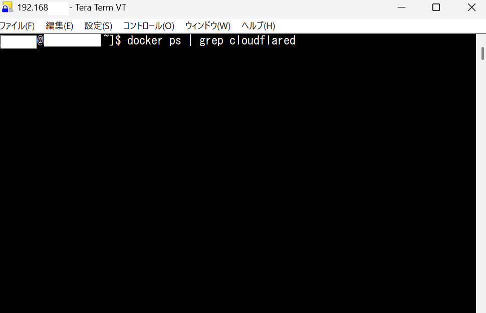 docker ps | grep cloudflared の実行結果。古いイメージで cloudflared コンテナが稼働中と表示されているSSH画面