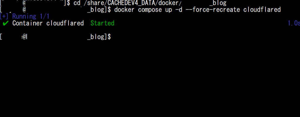 docker compose up -d --force-recreate cloudflared の実行結果。「Container cloudflared Started」が表示されたSSH画面