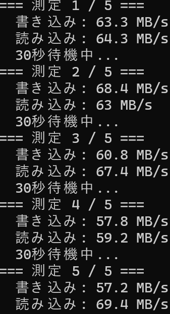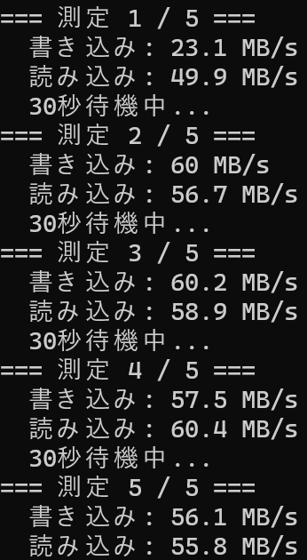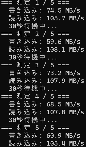 Write-Host "書き込み → 平均: $avgWrite  最高: $maxWrite  最低: $minWrite MB/s"