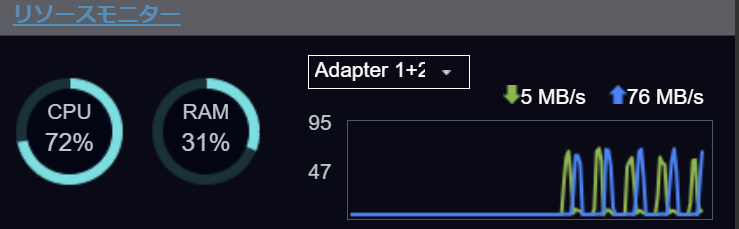 Tailscale転送中の QNAP NAS リソースモニター画面。CPU・ネットワーク負荷の状況が表示されている